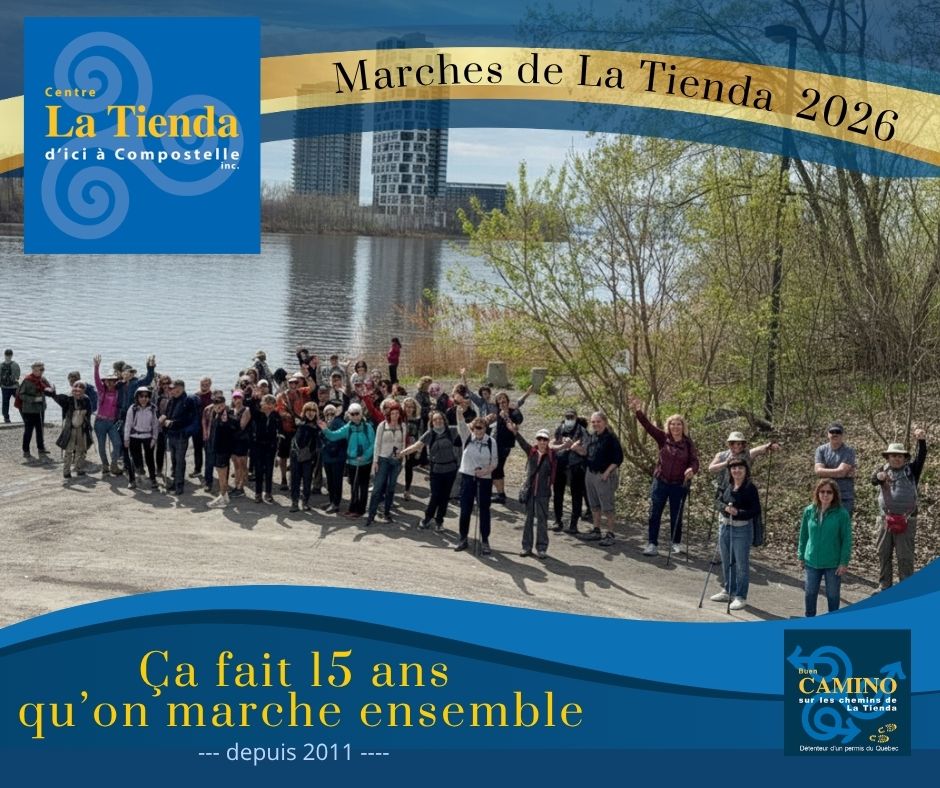 Cette marche à Montréal sera toute spéciale, puisque nous soulignerons également les 15 ans du Centre La Tienda. Depuis 2011, nous accompagnons les personnes qui souhaitent intégrer la marche dans leur quotidien ou se préparer à un projet de marche de longue durée, notamment vers Compostelle.